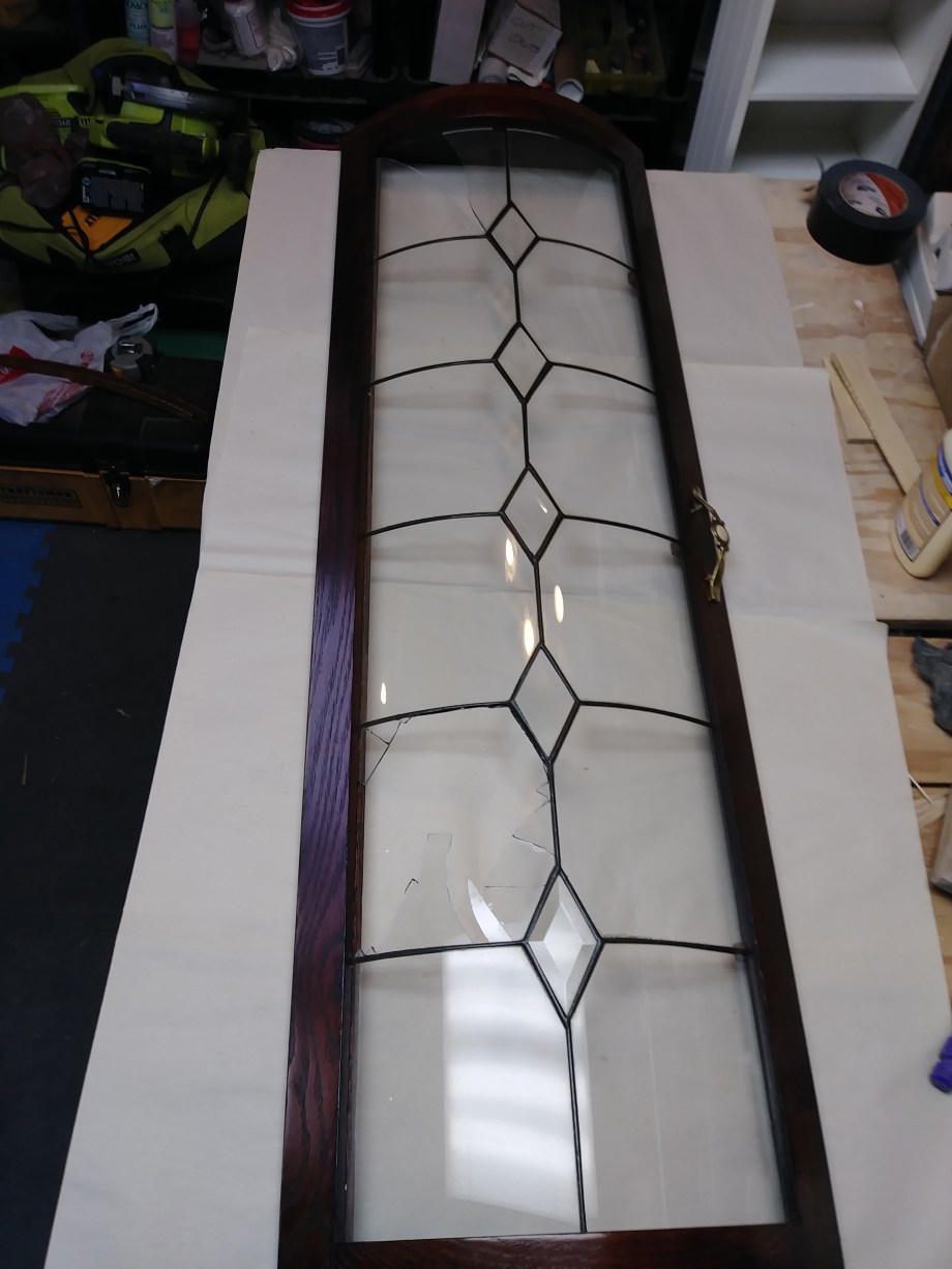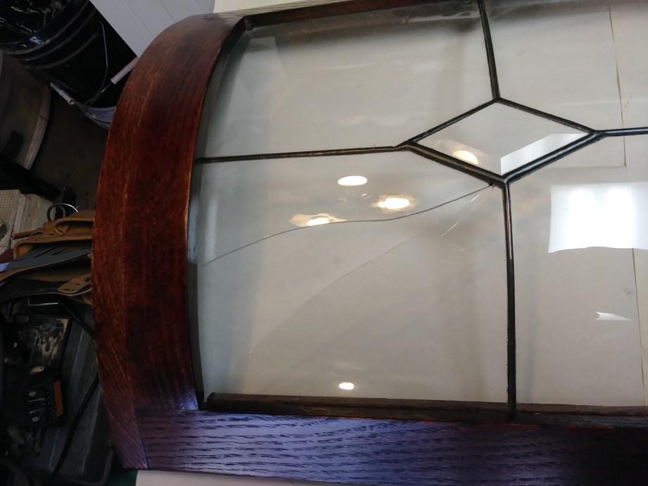 This one’s another cabinet door that’s suffered some damage, as the pictures show. Several of the larger panels are cracked pretty badly, and some of the glass is missing. They’re curved, so it’ll be a bit more of a challenge to get them replaced than would be the case were the panels flat. But we’re equal to it–and to meeting your art glass needs!