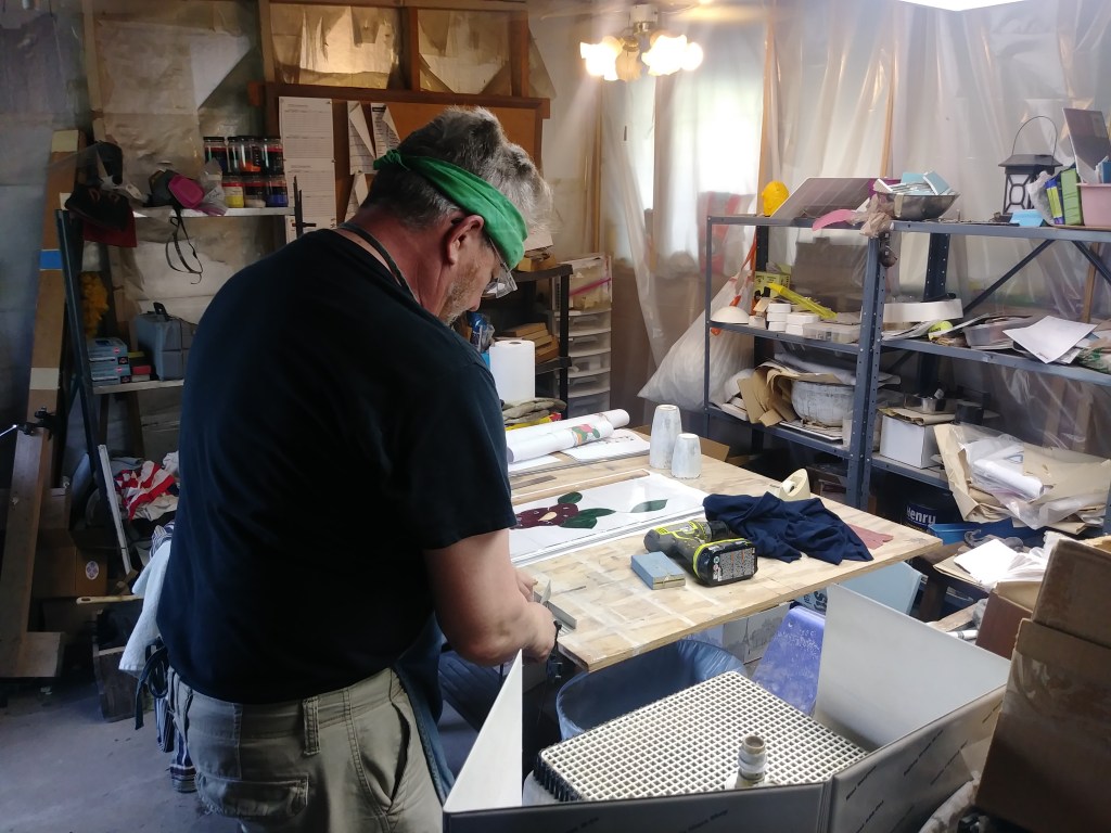 Right now, Kevin’s at work on a series of more than a dozen windows for a client in one of the nicer areas outside of town. They’re mostly floral windows, colored glass in clear panels, framed in zinc for greater stability.