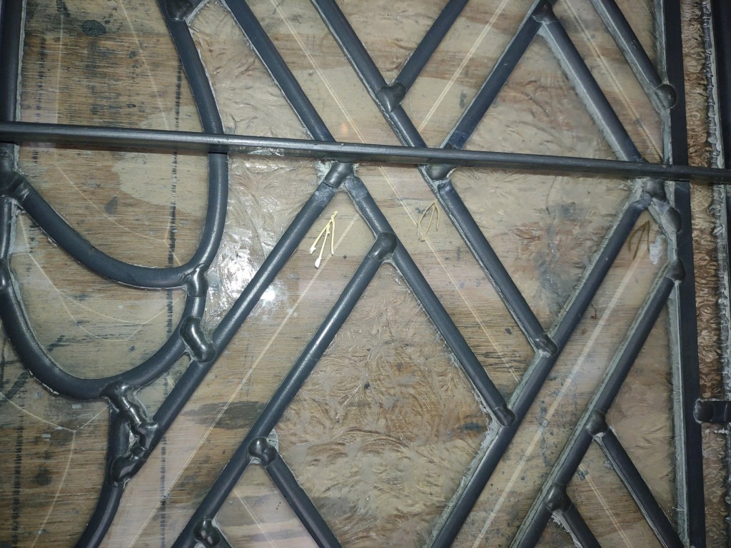A fair bit of the came–the metal support structure into which the individual pieces of glass are fitted–had broken, whether where the pieces were soldered together or where the metal itself had fatigued from years of the panel moving when the door was opened or closed or rattled by the winds that blow across the hills, rustling the cedar and mesquite that grows on them. Too, a few of the pieces of glass, themselves, had cracked for much the same reasons.