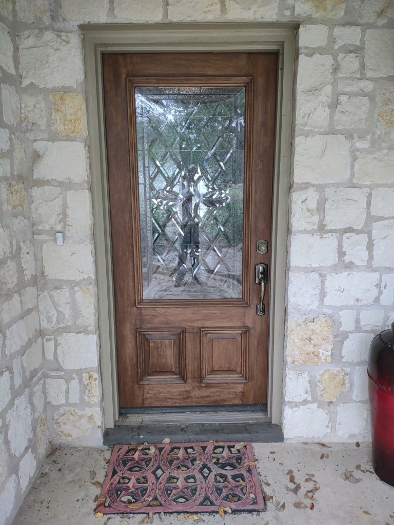 We were able to get the panel out of the door and the parts needing repair and replacement pulled out, fixed up, back together, and cleaned up. The panel went back into the door, along with some additional reinforcement to help keep the kindly Hill Country weather from getting too much hold on it, and the door went back into its frame at home, looking like this: