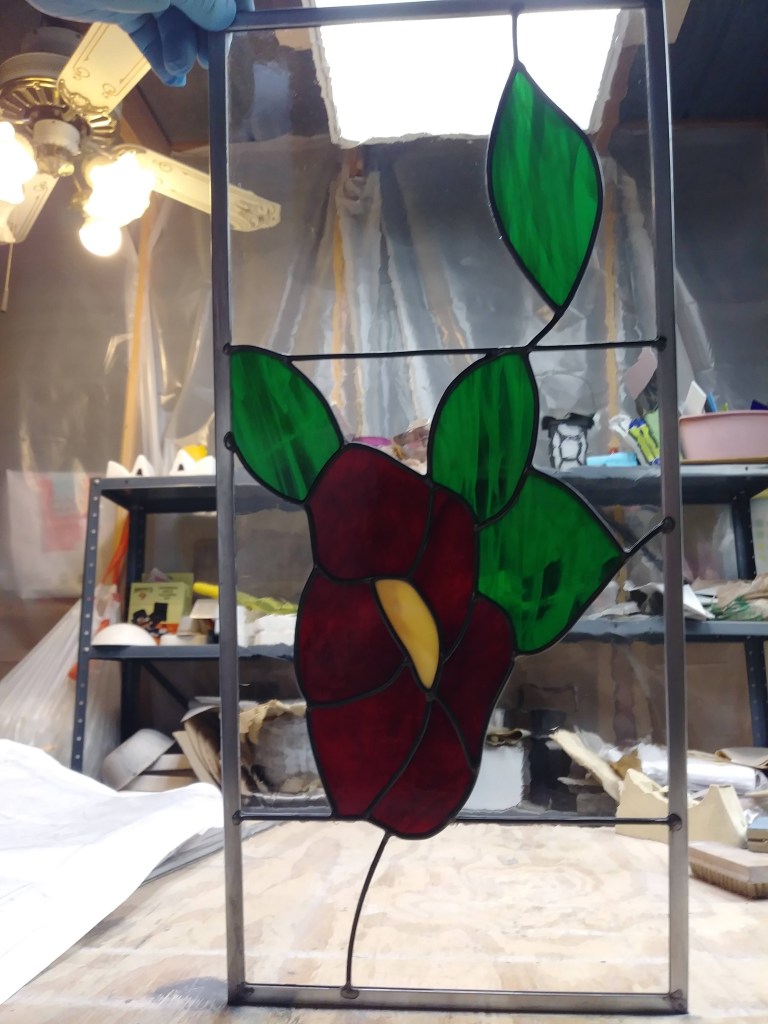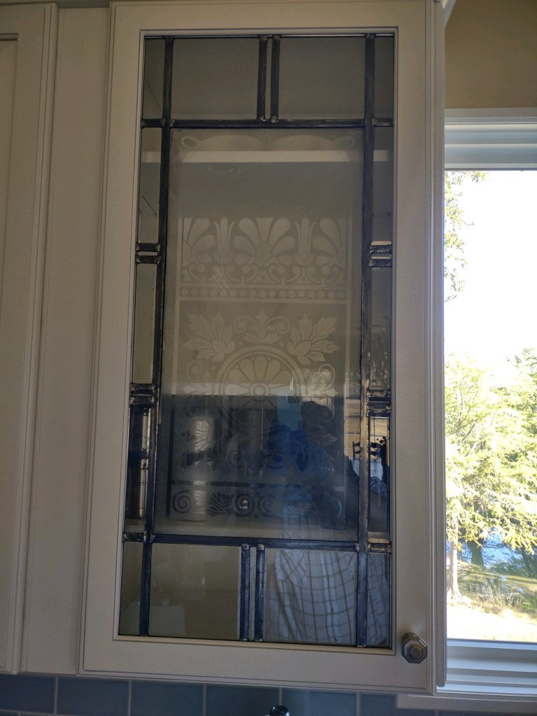 The broader came you see holding the original central panel in place is some of the zinc came we’ve noted before; a kitchen cabinet has to get opened and shut often, and sometimes with a fair bit of vigor, so it has to be able to stand up to use. The clear panels at top and bottom allow for ease of viewing, while the beveled panels to the sides add visual interest while still foregrounding the original etched glass. The folks we did the work for seem to be happy with it, and we’re pleased with the performance, too!