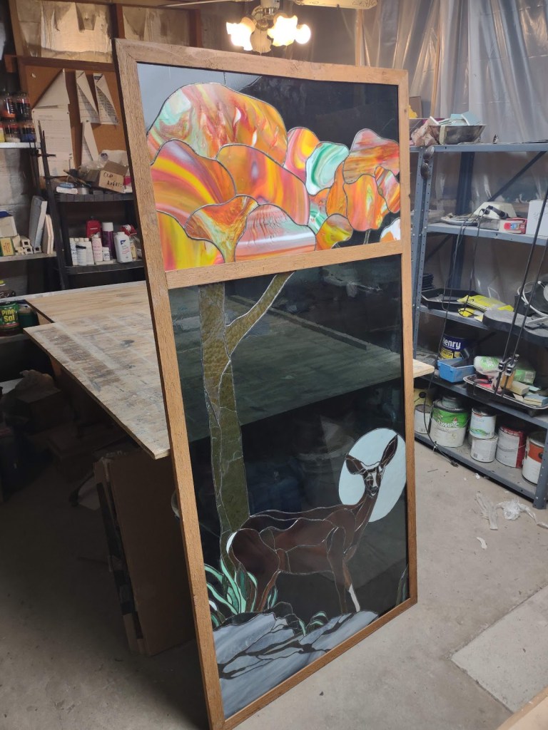 We noted last week that work on the Smith Panel Combination had proceeded, with the repairs to the glass and its joints handled and the two panels framed together. We’ve got the finish on the wood framing done, staining it to a lovely red cedar–as you can see below!