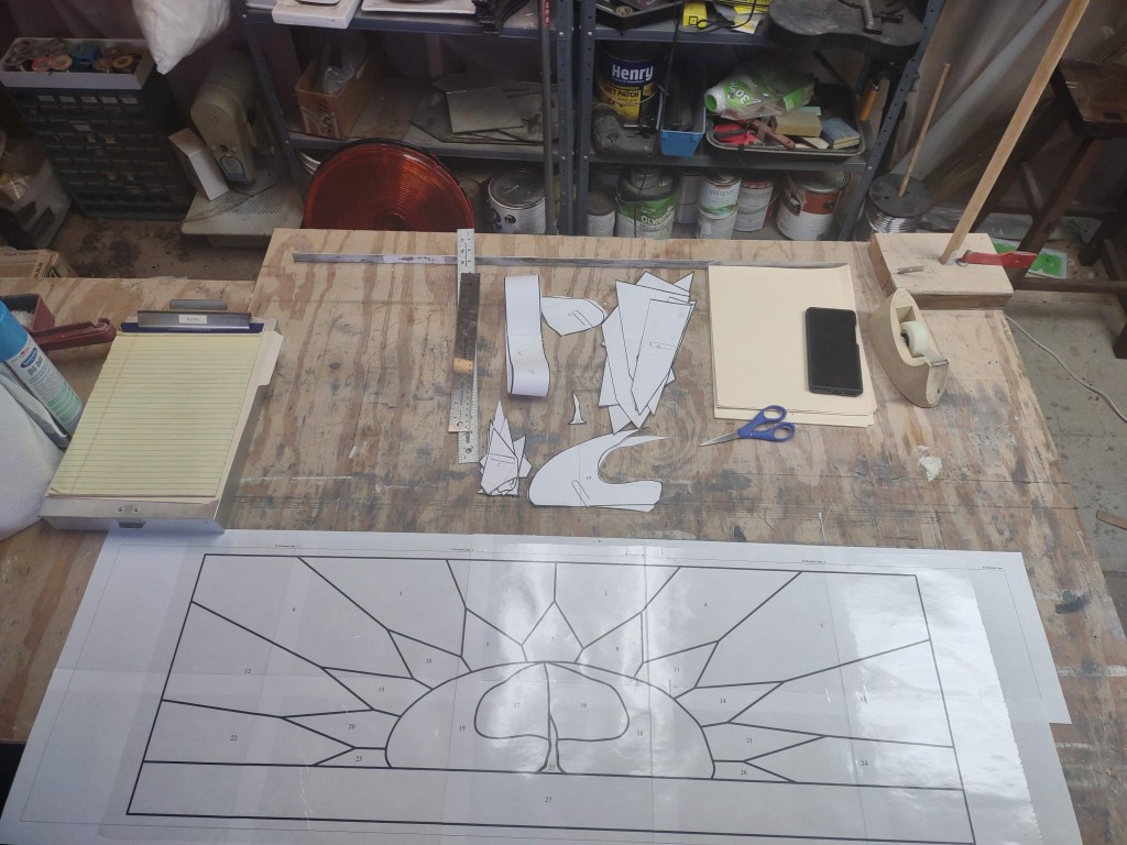 We ran that by the client and got the approval to start work on it–because we don’t get going on a custom piece for any client without their input and approval. For us, for a piece like this–one we’ll be putting into a metal frame, since a transom stands a good chance of needing to take some stresses–moves from a design draft to what we call a cartoon. That is, we print the layout out at full size, because having something in hand is a whole ‘nother thing from seeing it on a screen, and working in glass is as much about the feel of it as about anything else. That much done, we began making our reference pieces, giving ourselves something to lay under glass or over it so that we can get a good view of how the individual pieces will work with the specific glass we’ll end up using: