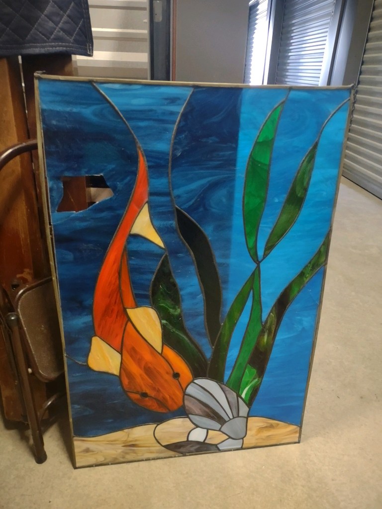 What had happened with this piece is that, while it was decently constructed–the outside edges are of sturdy zinc came, and there is some reinforcement in the piece–it was removed and moved, and handled badly amid that move. It’s not the first time we’ve encountered such a piece; we got one in one time that had been stepped on. But it’s always a shame to see it happen–especially with so vibrant a piece, and one that clearly was made with some attention to detail. Note how the streaks in the “water” largely align, suggesting the flow behind the koi; it’s not bad work at all, though it was treated badly later on.