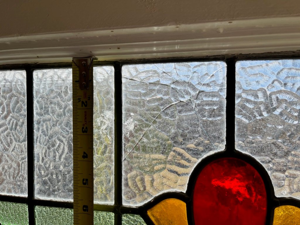 The most recent one to start with us is coming to us from Eldorado, Texas, a small city in the western Hill Country. Now, as folks who’ve lived in the area can tell you, we may not get a lot of rain in our part of the world, but when it does come, it’s like to come in abundance–and with company, namely hail. In Kerrville, we’ve had hailstorms that left the town coated in little ice pellets, standing a foot deep in some places, and many’re the folks who’ve had close encounters with quarter-sized chunks of ice coming from the sky. (It ain’t comfortable.) As might be imagined, such storms–and we’re always glad of rain–wreak havoc on windows, including such stained glass pieces as our soon-to-start project, the Frey Repair.