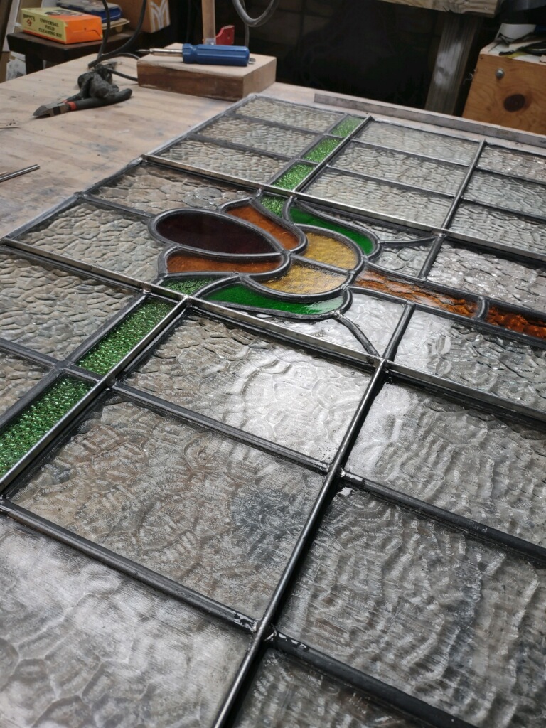 Things seem to keep coming up, but we get through them–and we continue to make progress on the work we’re doing. In this case, we’ve continued work on the Frey piece, having removed and replaced the broken glass and adjusting such joints as needed work. That much done, we took pains to protect the piece, adding reinforcing rods in a stiffer, more durable material, so that the panel will have the structural strength to face the world well.