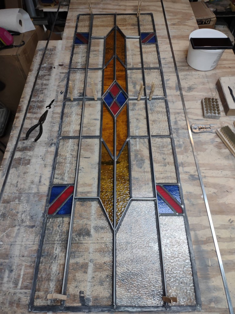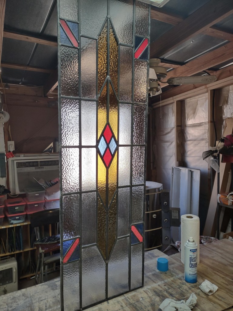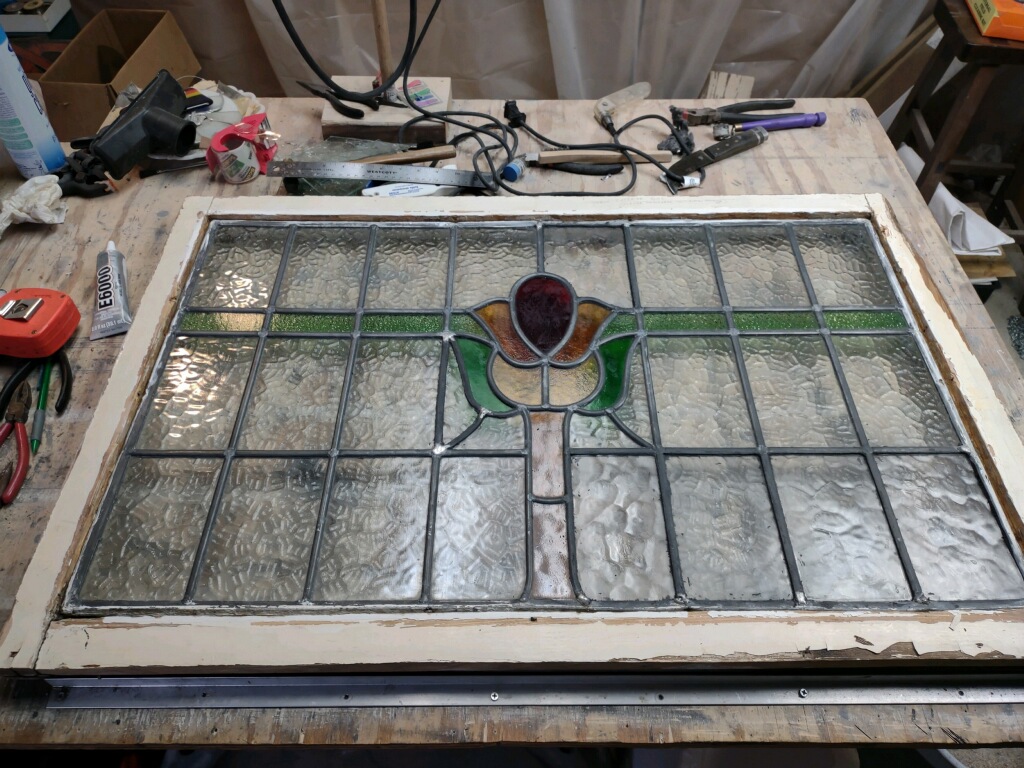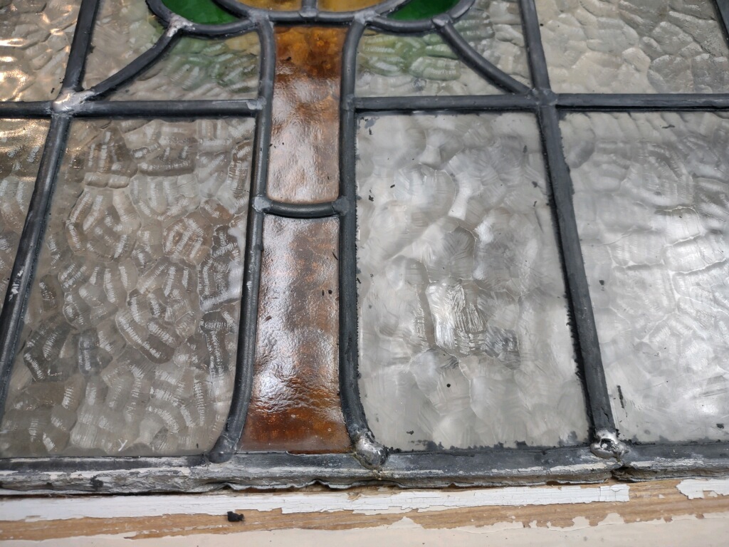 Admittedly, a barrister cabinet needs to show what it holds. Clear, rather than colored and textured, glass is desirable therefore; it’s hard to read book titles through swirling opalescence. Fortunately, we tend to keep clear glass on hand, and so it was no difficult thing to separate the pieces of came, remove the broken glass, cut new pieces to fit, and reassemble the panel. Backed by our guarantee, the repaired piece went back to its owner–and the owner, by all accounts, is delighted with the work!