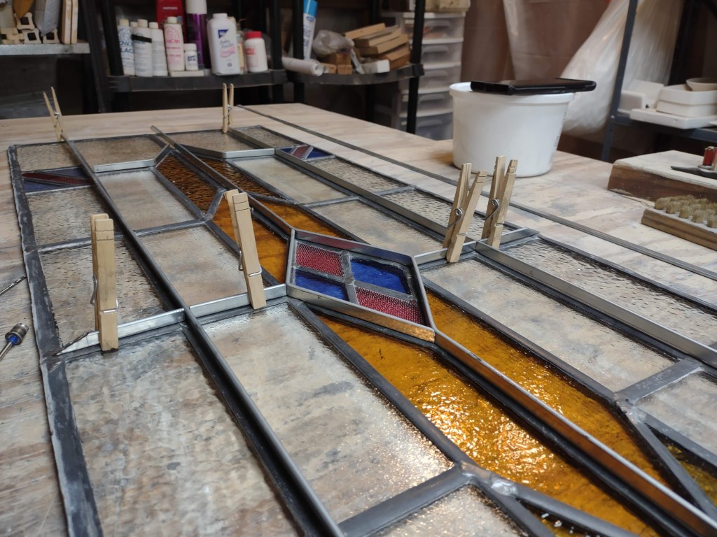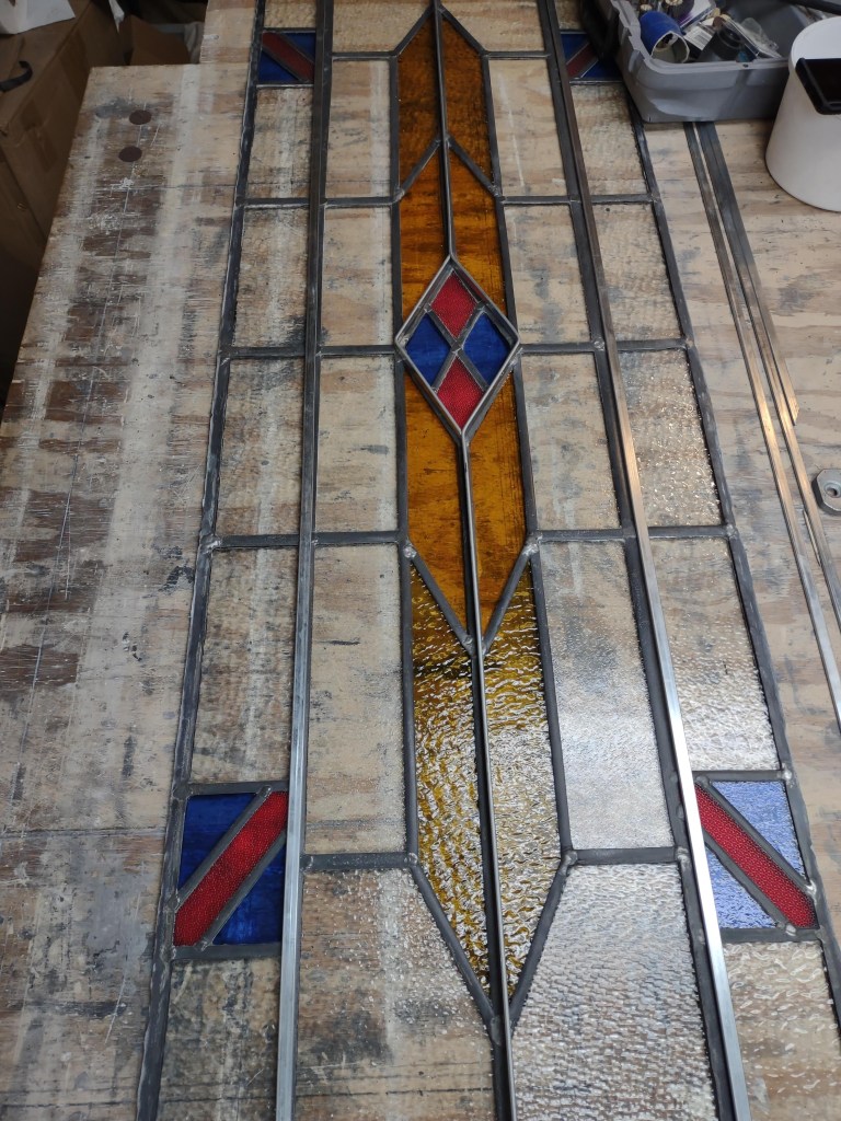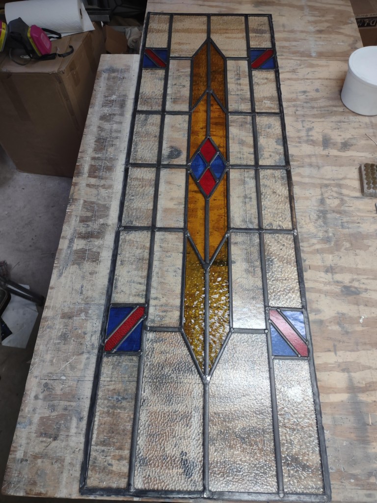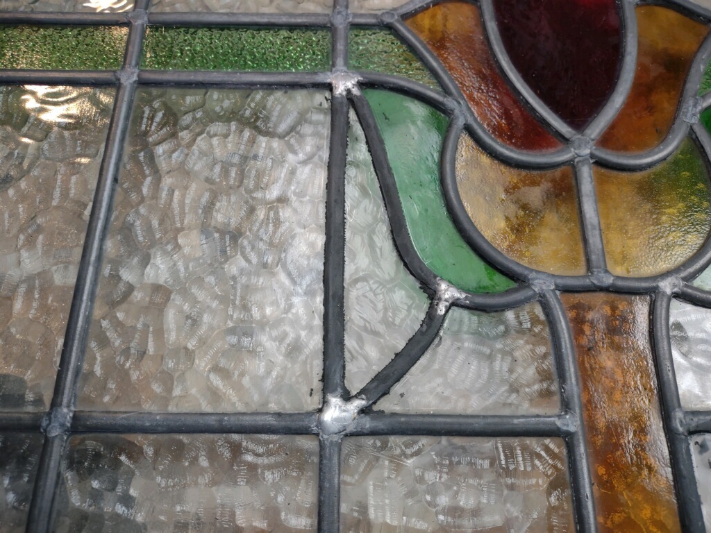 Admittedly, a barrister cabinet needs to show what it holds. Clear, rather than colored and textured, glass is desirable therefore; it’s hard to read book titles through swirling opalescence. Fortunately, we tend to keep clear glass on hand, and so it was no difficult thing to separate the pieces of came, remove the broken glass, cut new pieces to fit, and reassemble the panel. Backed by our guarantee, the repaired piece went back to its owner–and the owner, by all accounts, is delighted with the work!